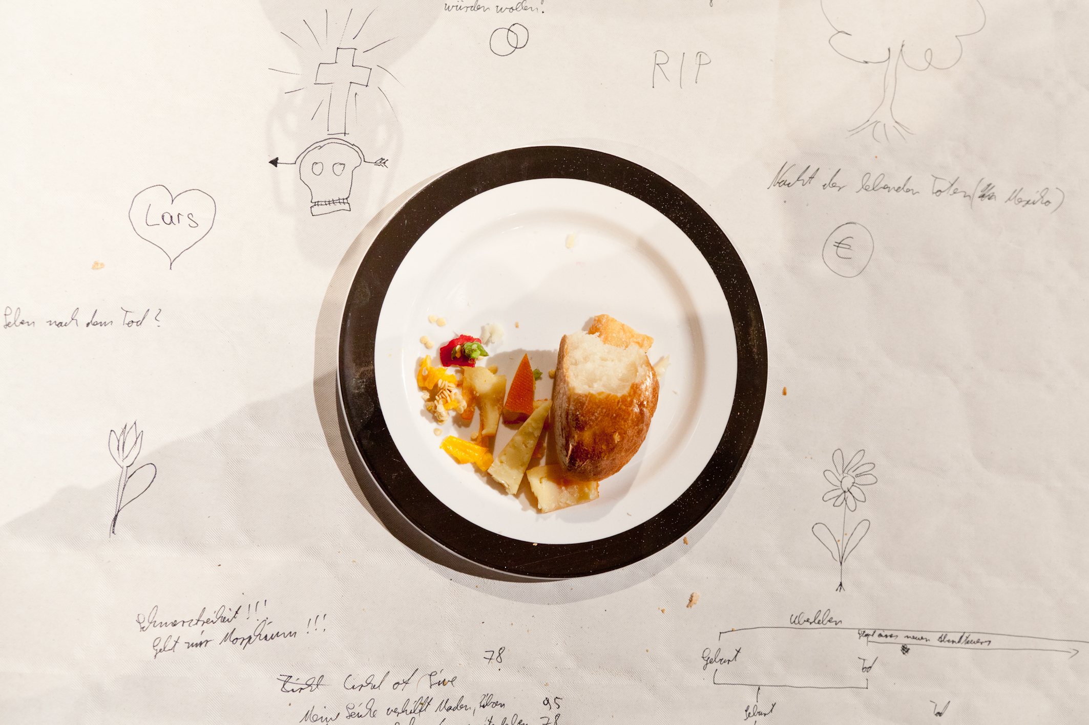 This piece is about the realization of our own mortality. Part performance, part honest conversation we explore the many aspects of death in our current western society - from deeply personal decisions to its commercialisation. Since both artists have eaten and performed with people connected to a South London hospice in 2014, they have been fascinated by the very special connection between food and dying. A connection between survival and the end of it, a connection that is inscribed in various rituals: From the motive of the last supper which is given new meaning by the assisted suicide movement to the Austrian tradition of "Leichenschmaus".