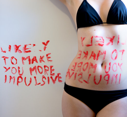 „Likely to make you more impulsive“ is written mirrored onto the belly of a woman in bikini. It is body-printed against a canvas on the wall which makes the sentence readable and starts the communication with the spectators.